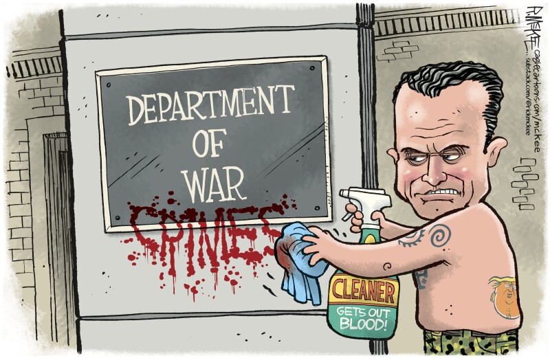 The illustration presents a satirical view of Hegseth’s role, suggesting he has had a significant impact on shaping policies that some critics label as war crimes. By using humor and irony, McKee engages the audience in a conversation about the moral implications of defense strategies and the individuals behind them.