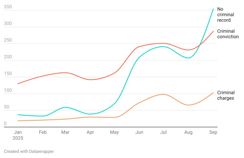 According to an analysis by the Deportation Data Project, a research group affiliated with the University of California, Berkeley, 48 percent of people arrested by ICE in September 2025 lacked any prior criminal background. In contrast, 39 percent had a criminal conviction, while the remaining 14 percent were facing pending charges. The data highlights a marked increase in such arrests, which have more than tripled compared to previous months.